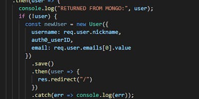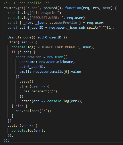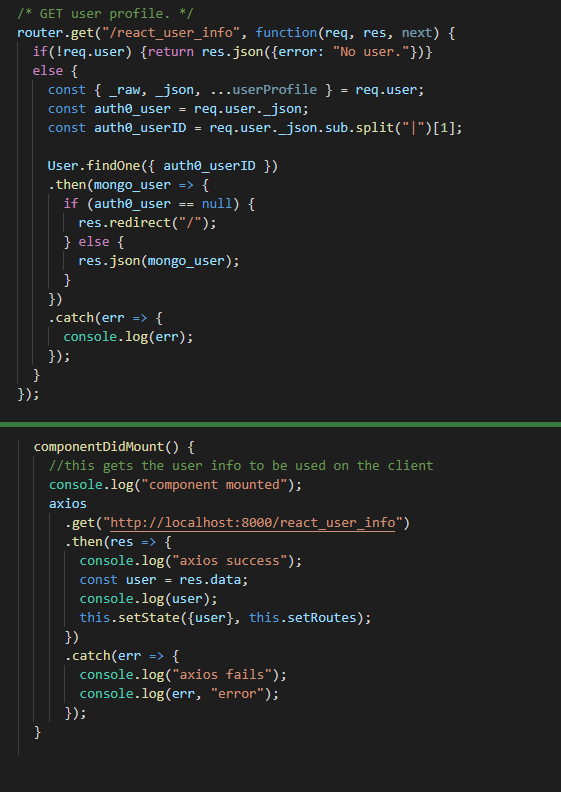 This is where we started. Setting the server to save our user to the database, retrieving that user upon sign-in, and getting that information to exist on our client's state was what I had worked on this week. In order to accomplish this, I had replicated what another of our test functions was accomplishing by sending the user information back as a JSON object to our /user endpoint. We created a new endpoint called /reactuserinfo to modify what was happening with the secured() middleware. The redirect was causing errors to be thrown when we were not logged in, as it had been sending a redirect request to the login page through axios when attempting to fulfill the duties of the middleware (to check that the user is logged in, and if not, then redirecting to the login page).